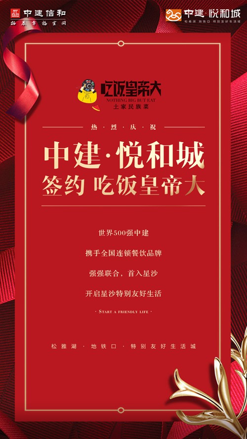 近日,中建·悦和城项目成功签约五十七度湘餐饮管理有限公司旗下一线餐饮品牌“吃饭皇帝大”。这是我司继中建·信和城项目成功牵手“好食上天然台”品牌后,二度与五十七度湘公司合作。