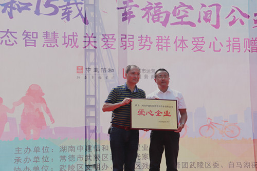 为弘扬中华民族扶贫济困的传统美德,更好关爱弱势群体,彰显央企社会责任,6月15日上午,中建信和地产首个片区开发项目——中建·生态智慧城成功举办“缘起信和15载幸福空间公益行”关爱弱势群体爱心捐赠活动。常德市武陵区文明办、共青团武陵区委、武陵区残联、武陵区西城阳光家园及常德市主流媒体代表参加活动。