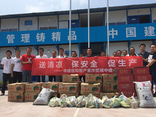 高温天气工人露天作业,体能消耗大,为切实做好一线人员的防暑降温工作,中建·瑾和城项目公司购买了防暑药品、凉茶、矿泉水、西瓜、绿豆等清凉物资,由项目负责人曾远亮带队为他们送去清凉和关怀,并提醒所有人员在高温环境下作业一定要做好防暑降温,同时做好安全工作,包括施工现场安全、住宿安全、出行安全及食堂安全等,确保安全生产零事故。
