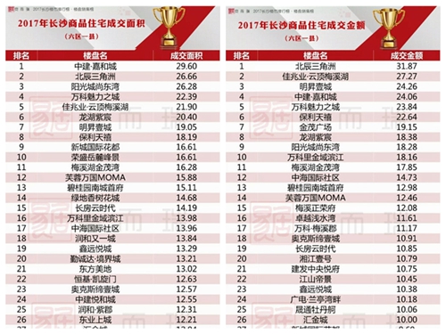 长沙高层住宅成交面积、成交金额排行榜(数据来源克而瑞)